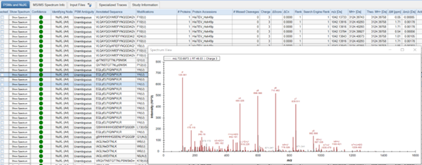- You can manually validate spectra quality by viewing annotated spectra. To do so, click on the “Show Spectrum” button in the ‘PSM and NuXL’ tab.